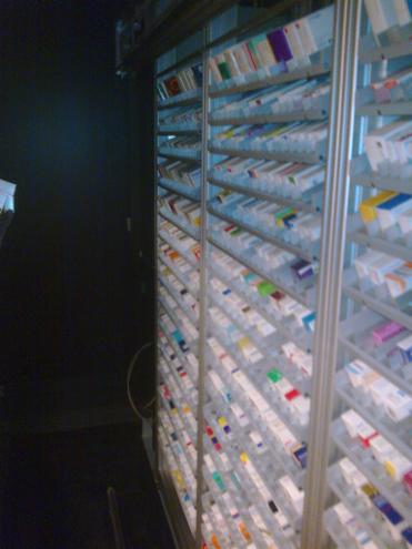 El sistema almacena de forma caótica los productos farmacéuticos mediante uno o varios robots, colocándolos en estanterías especialmente diseñadas para aprovechar al máximo el espacio del almacén de la farmacia.